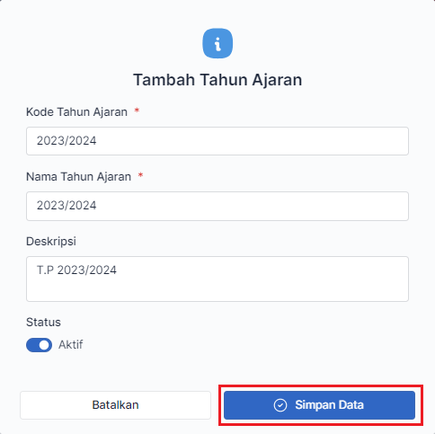 - Status : Pilih status tahun ajaran, apabila status non-aktif maka tahun ajaran tidak dapat digunakan pada aplikasi.