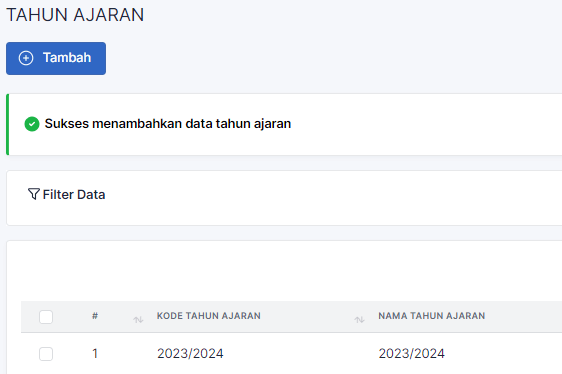 Jika proses simpan data berhasil maka akan muncul notifikasi yang memberitahukan bahwa data tahun ajaran berhasil ditambahkan