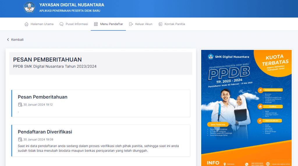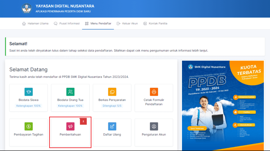 2. Calon Peserta didik dapat melihat pesan pemberitahuan administrasi, pengumuman, dan pembayaran PPDB.