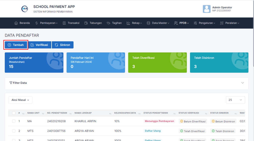 Untuk menambah data pendaftar pada aplikasi School Payment App (SPA), dapat ikuti langkah-langkah berikut :