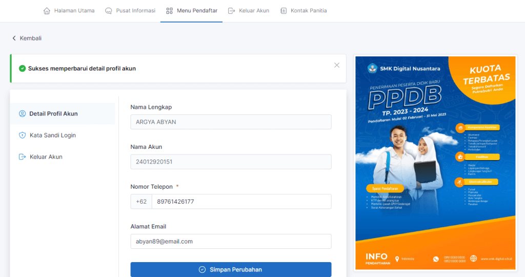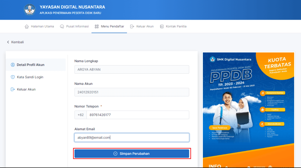 Siswa dapat mengubah Nomor Telepon dan menambahkan Alamat Email.