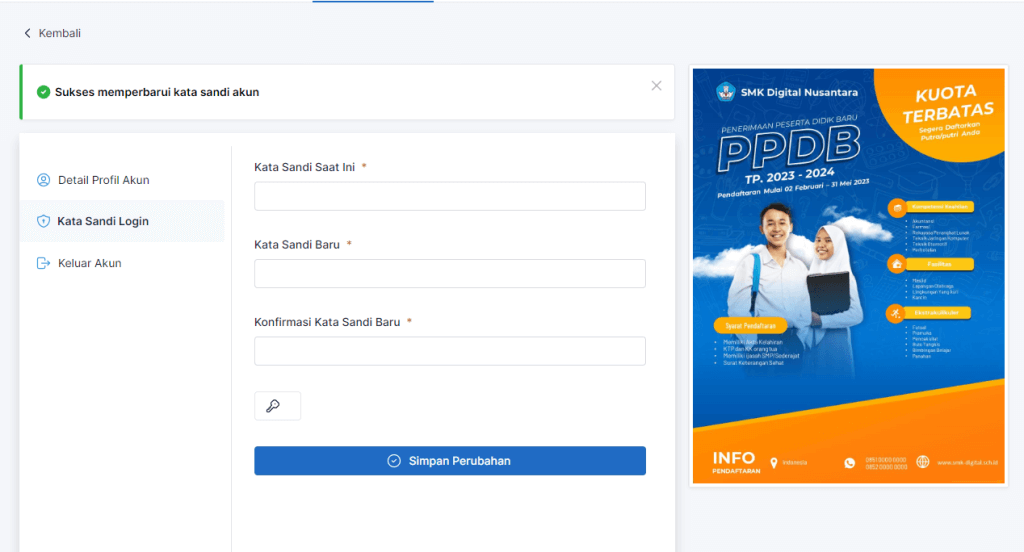 Jika proses mengubah Kata Sandi berhasil maka akan muncul notifikasi yang memberitahukan bahwa Kata Sandi berhasil diperbarui.